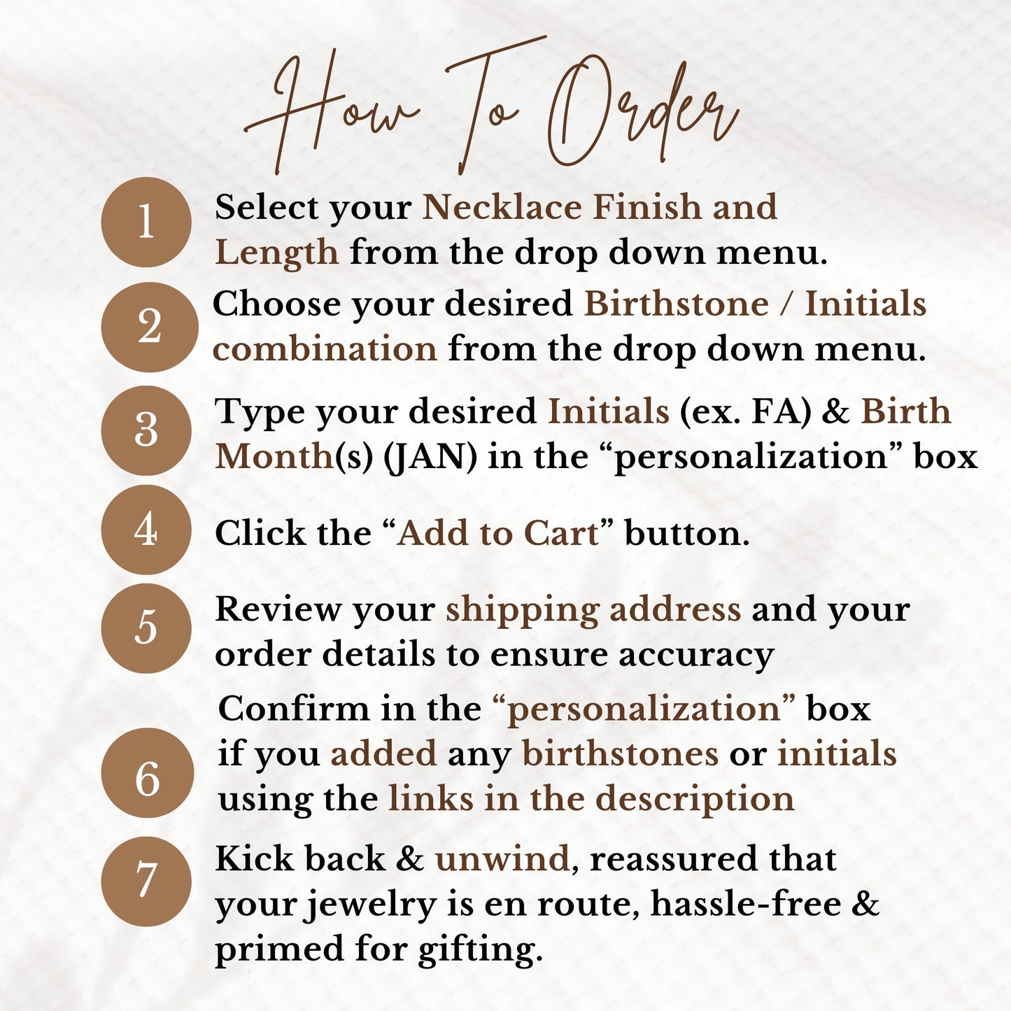 6. Confirm in the “personalization” box if you added any birthstones or initials using the links in the description